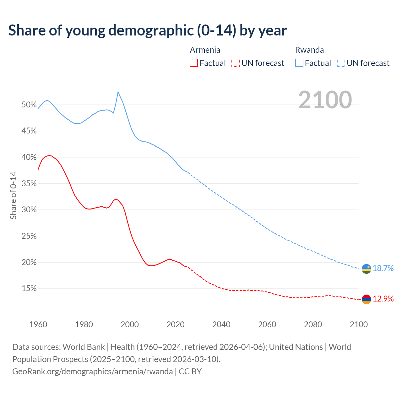 - The share of young demographic (0-15 years old) in Armenia is 19.2% vs 37.4% in Rwanda.
