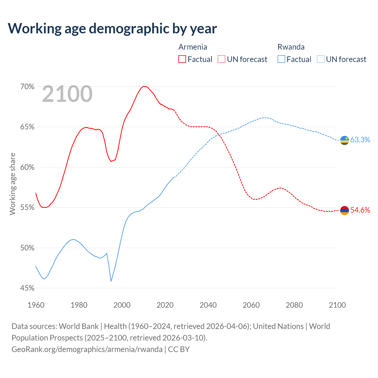 - Armenia has 2M working age adults (aged 15-64) vs 8.79M in Rwanda.