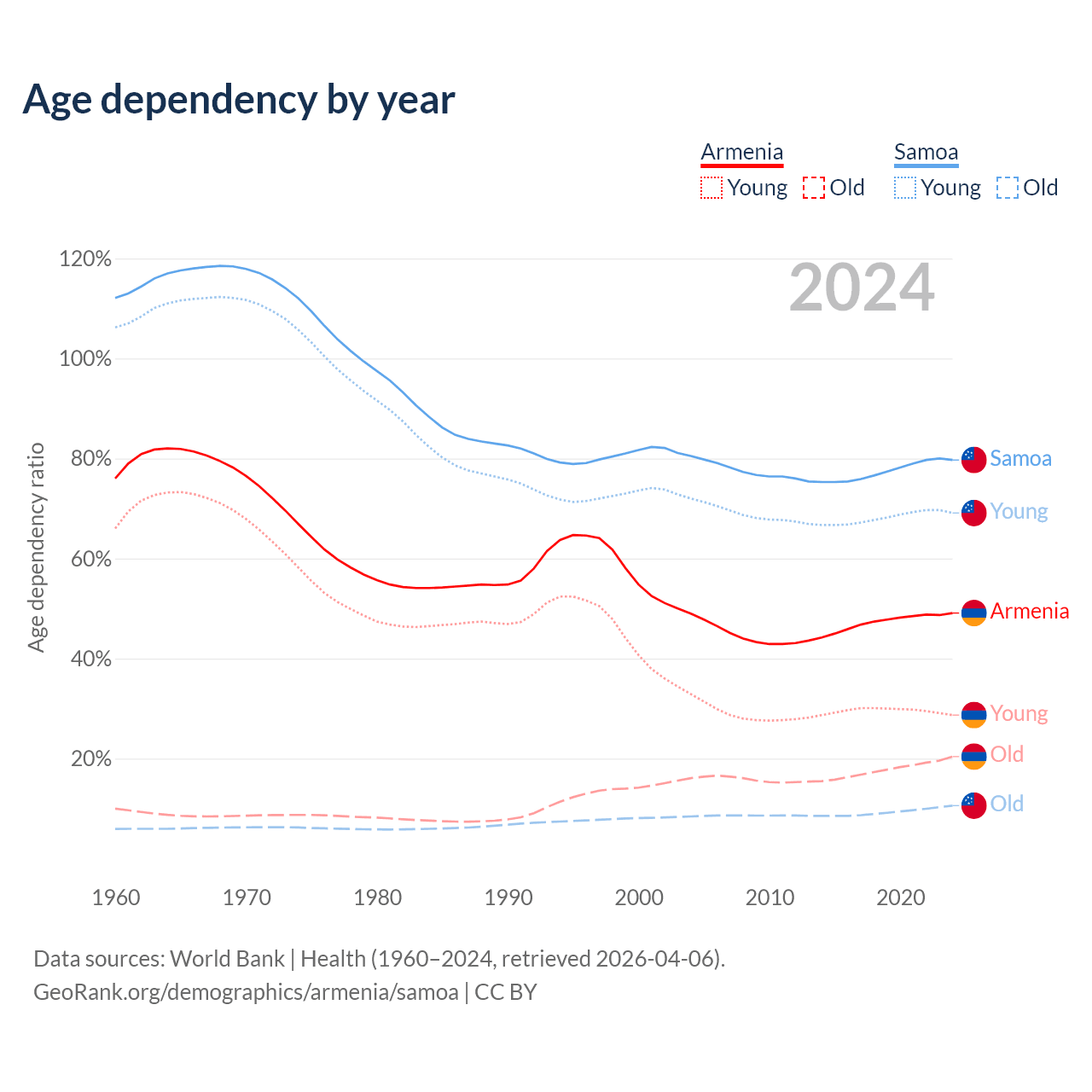 - The share of old-age demographic (65+) in Armenia is 13.7% vs 5.88% in Samoa.