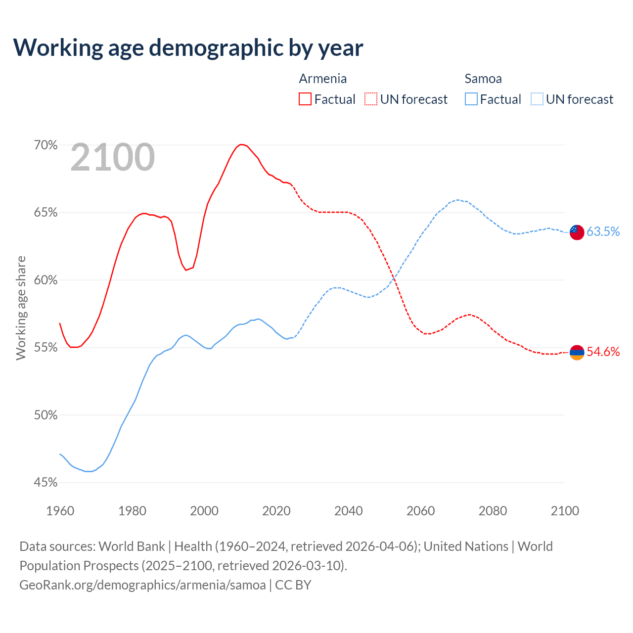 Median age Armenia vs Samoa, 1960-2100