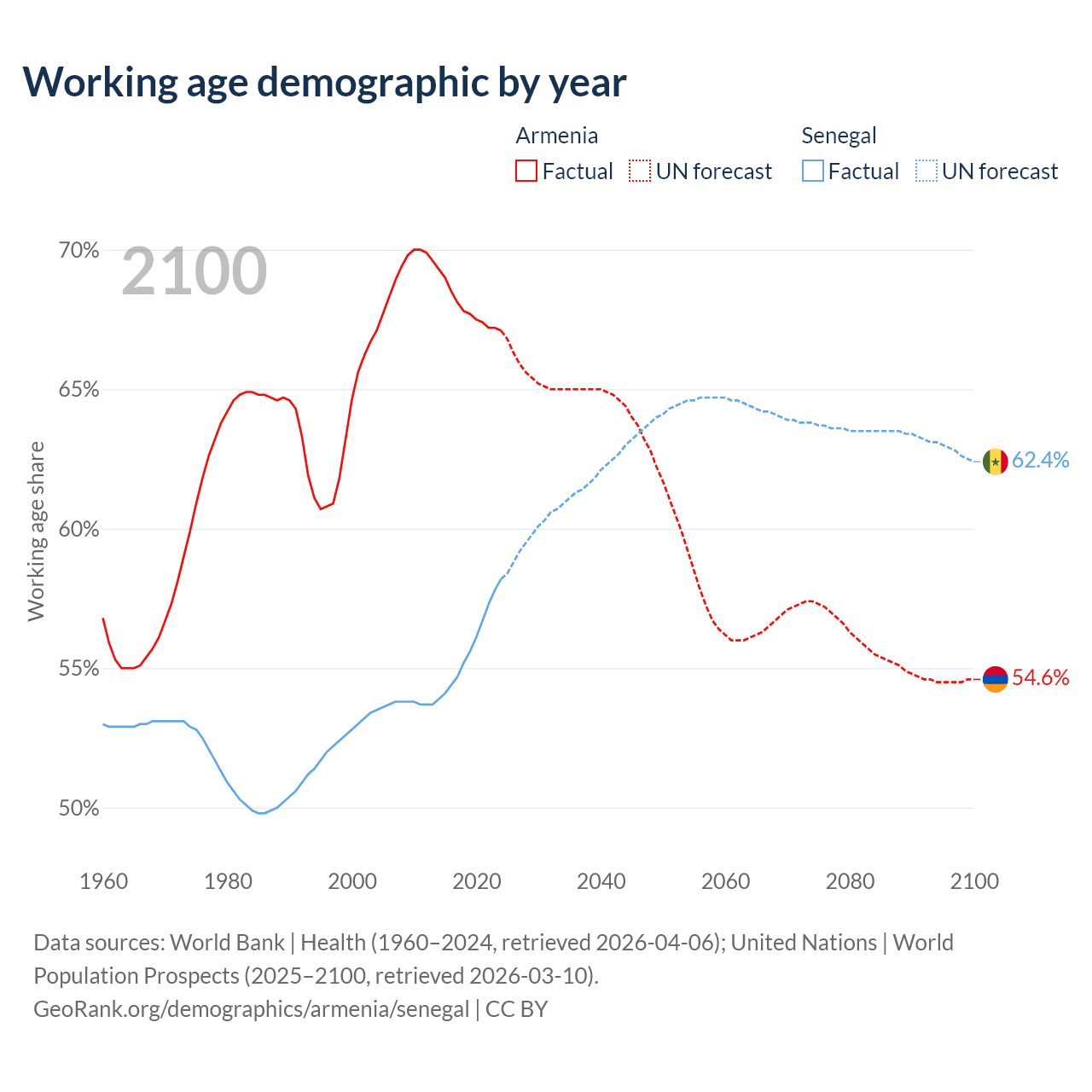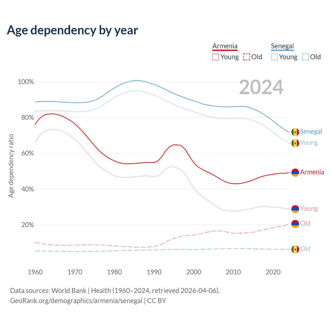The share of older people aged 65 and over is 13.7% in Armenia and 3.62% in Senegal. Life expectancy in Armenia compared to Senegal .