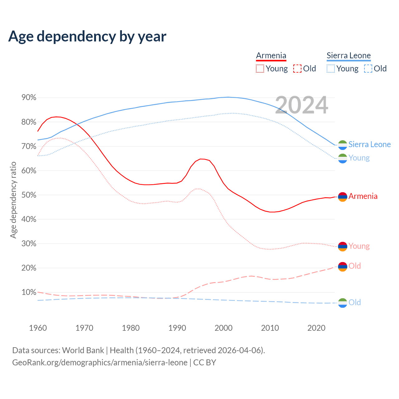 - The share of old-age demographic (65+) in Armenia is 13.7% vs 3.24% in Sierra Leone.