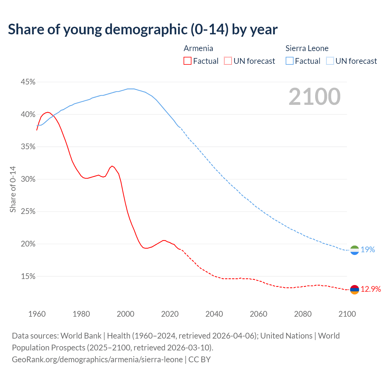 - The share of young demographic (0-15 years old) in Armenia is 19.2% vs 38.1% in Sierra Leone.