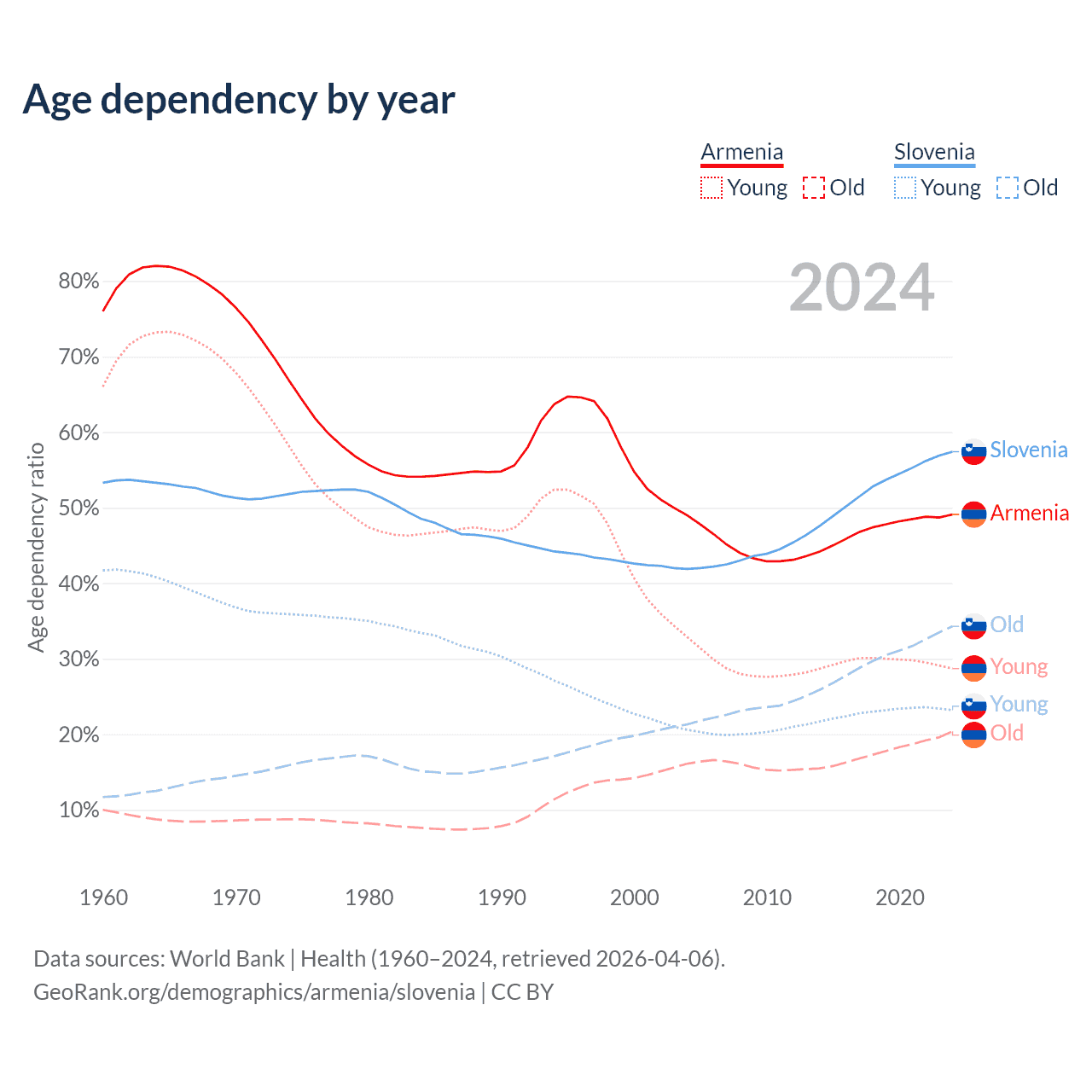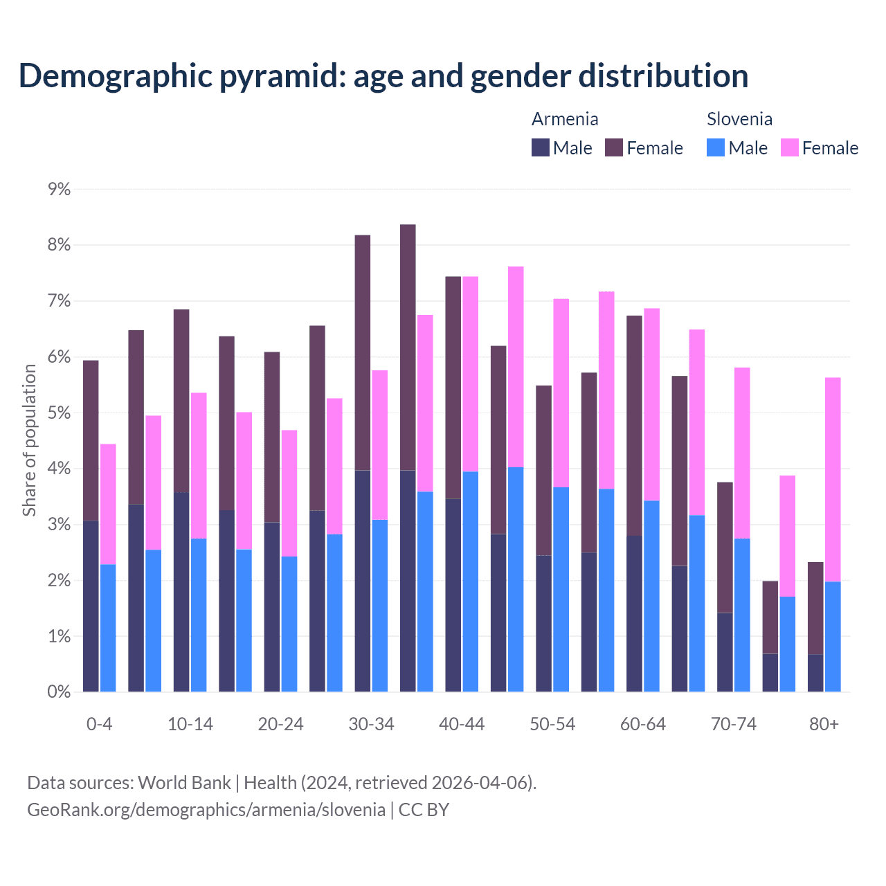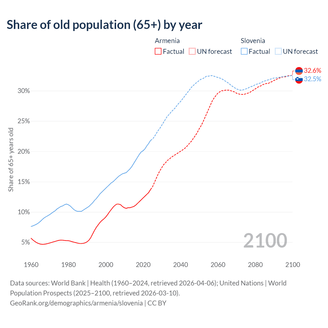 The share of older people aged 65 and over is 13.7% in Armenia and 21.8% in Slovenia. Life expectancy in Armenia compared to Slovenia .