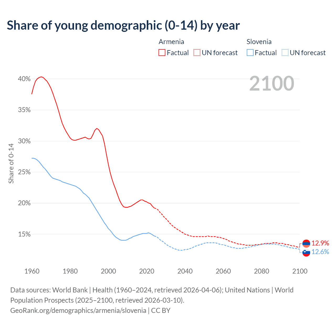 - The share of young demographic (0-15 years old) in Armenia is 19.2% vs 14.7% in Slovenia.
