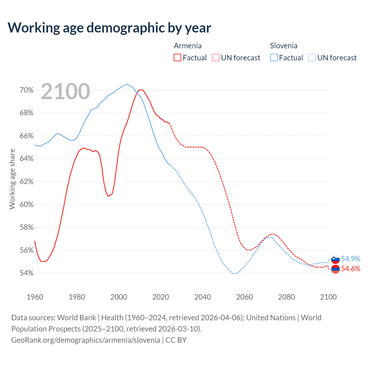 - Armenia has 2M working age adults (aged 15-64) vs 1.35M in Slovenia.