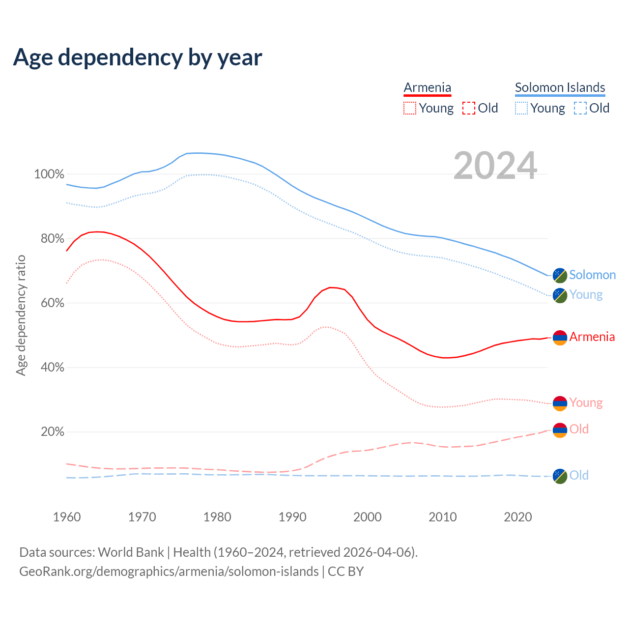 - Armenia is ranked 64/196 by median age (oldest to youngest) vs 153/196 for the Solomon Islands.