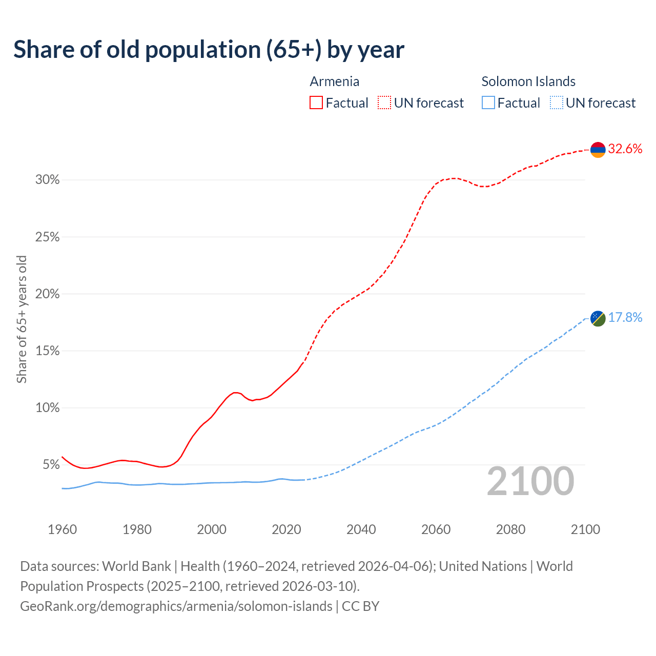 The share of older people aged 65 and over is 13.7% in Armenia and 3.64% in the Solomon Islands. Life expectancy in Armenia compared to the Solomon Islands .