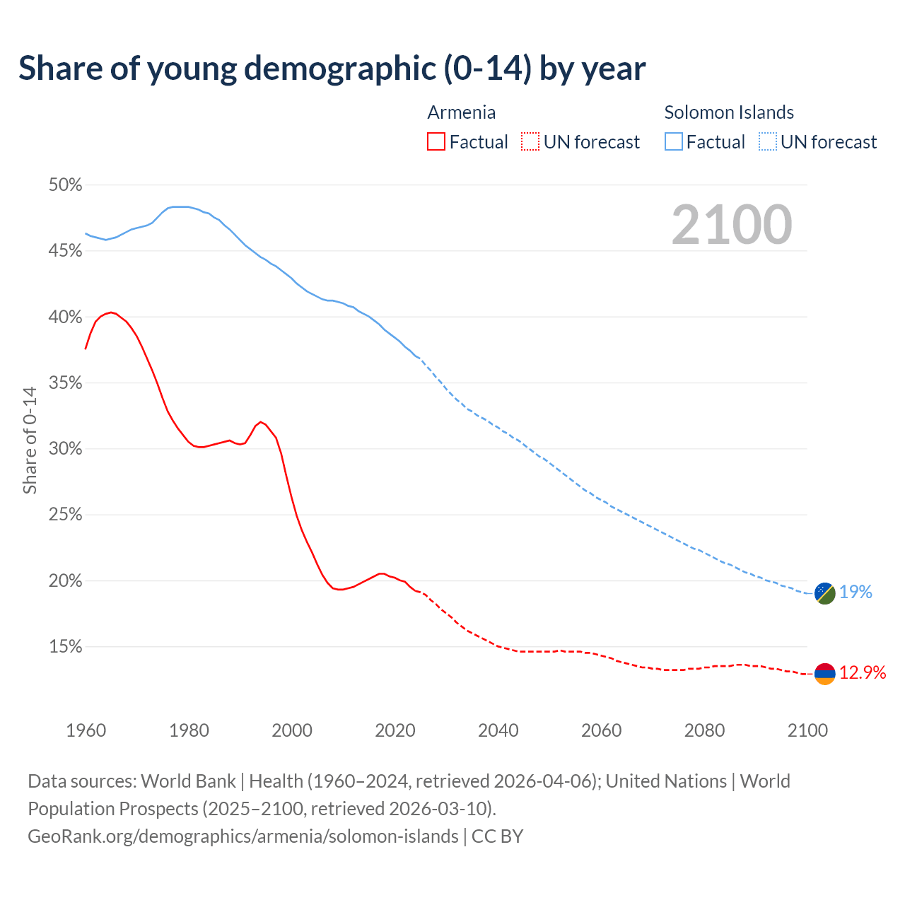 - The share of young demographic (0-15 years old) in Armenia is 19.2% vs 37% in the Solomon Islands.