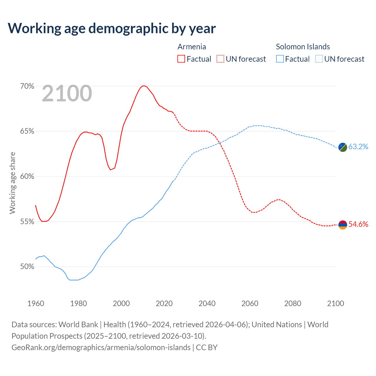 - Armenia has 2M working age adults (aged 15-64) vs 513K in the Solomon Islands.