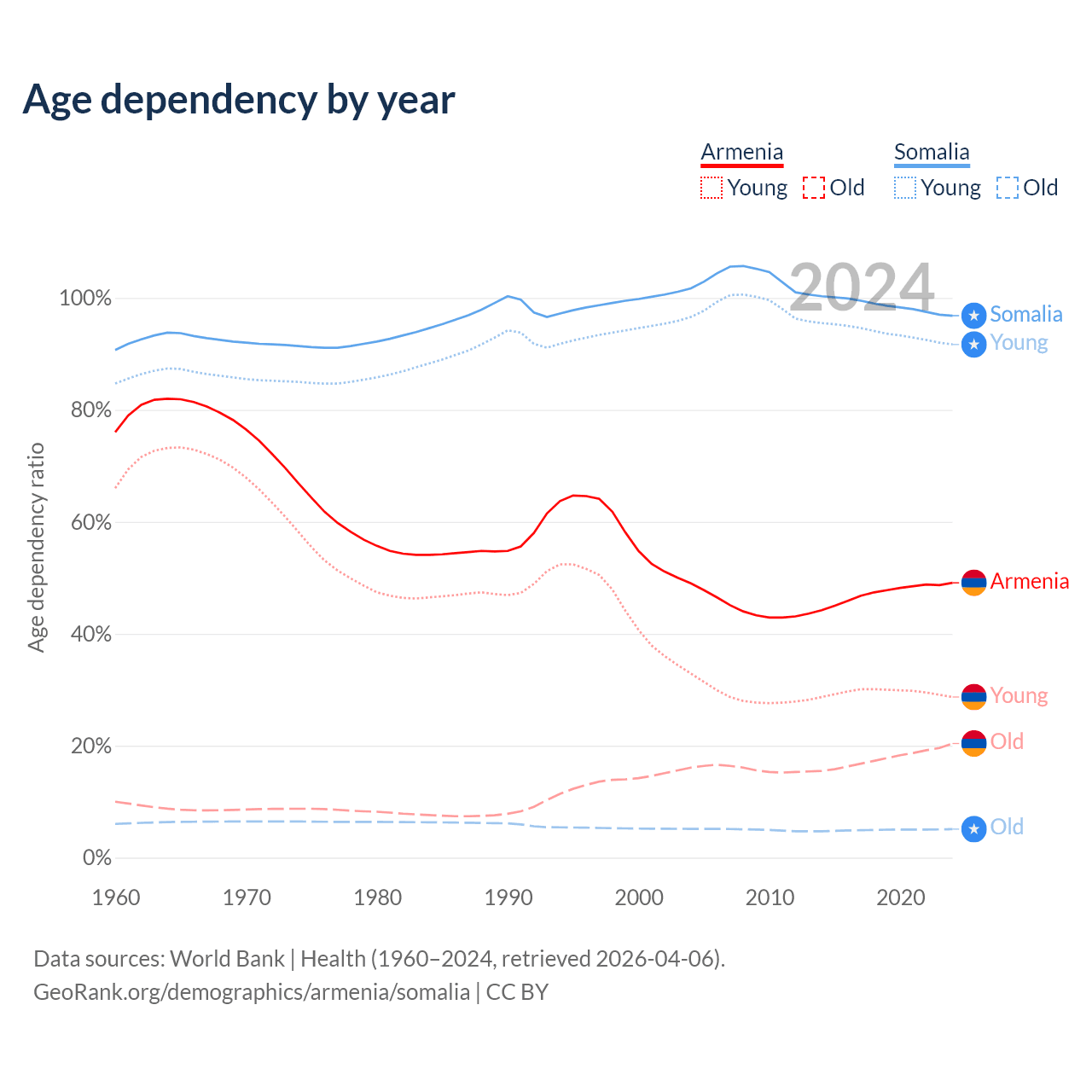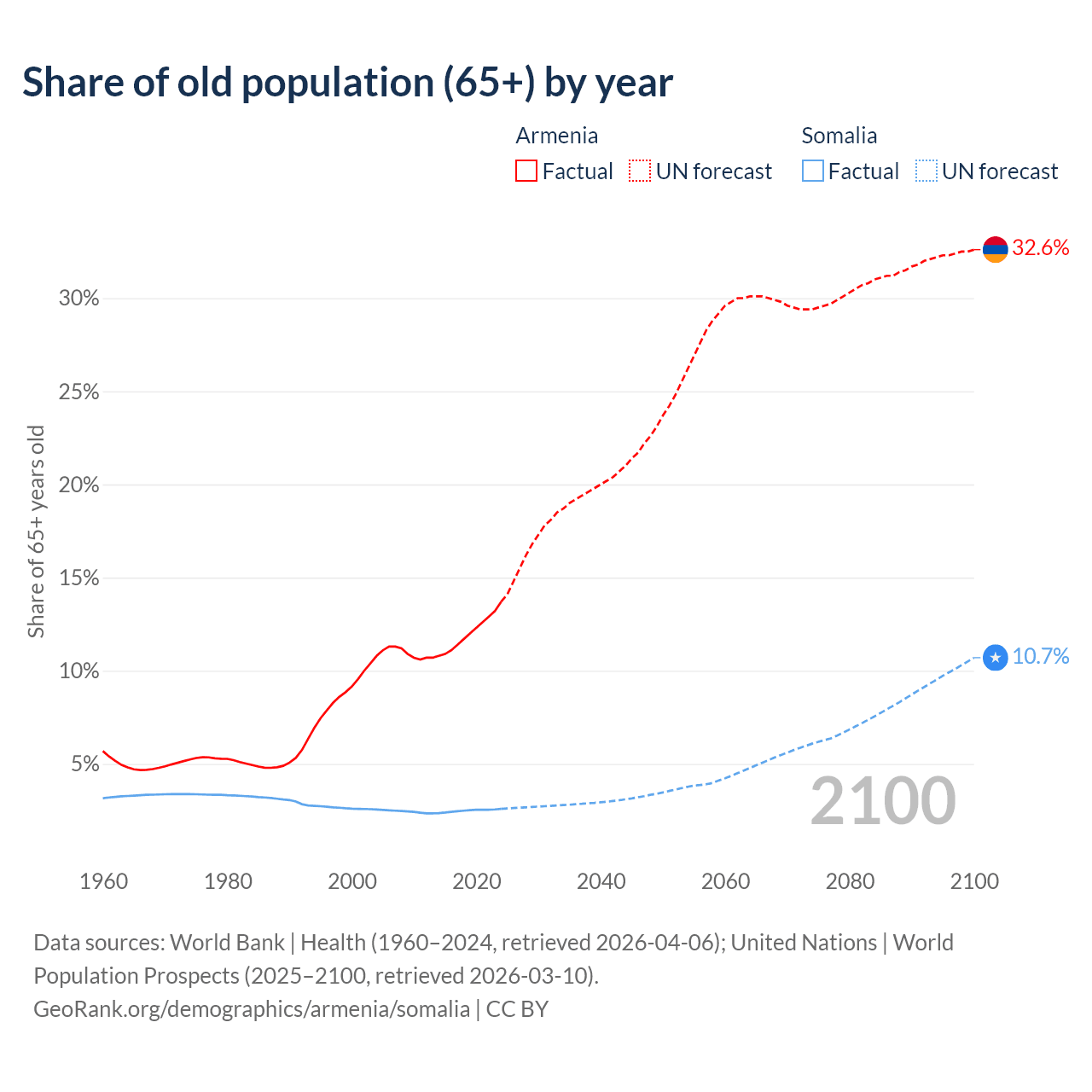- The share of old-age demographic (65+) in Armenia is 13.7% vs 2.59% in Somalia.