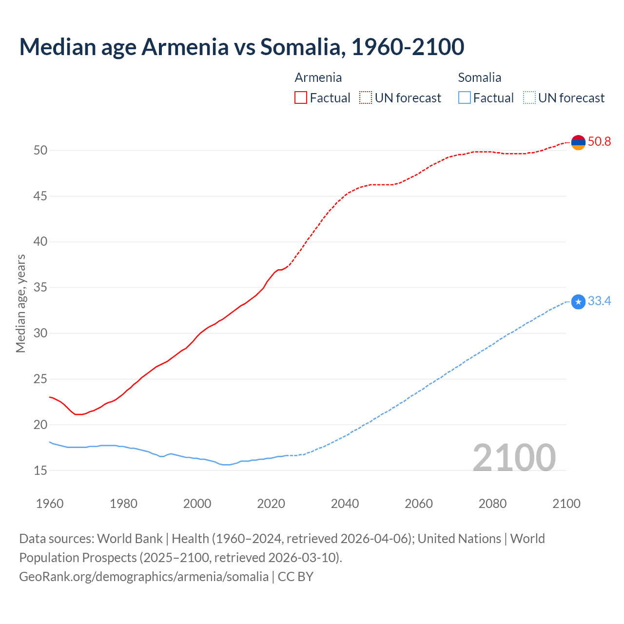 - Armenia is ranked 64/196 by median age (oldest to youngest) vs 194/196 for Somalia.