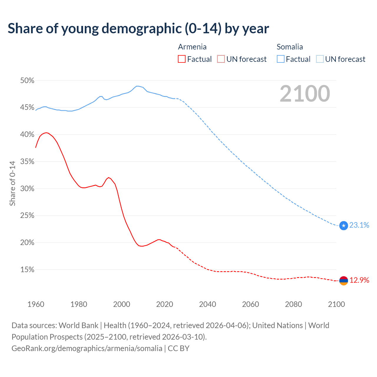 - The share of young demographic (0-15 years old) in Armenia is 19.2% vs 46.6% in Somalia.