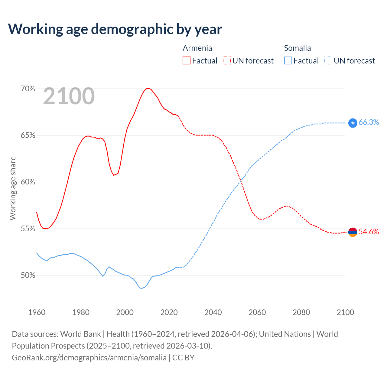 - Armenia has 2M working age adults (aged 15-64) vs 10.4M in Somalia.