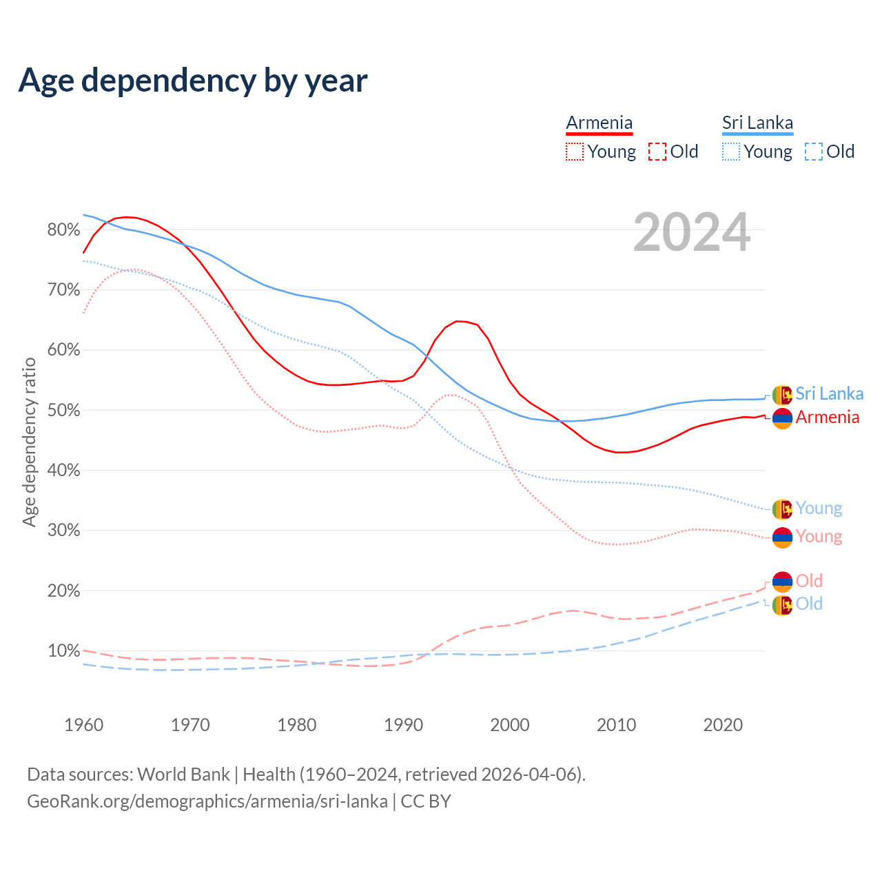 The share of older people aged 65 and over is 13.7% in Armenia and 12.1% in Sri Lanka. Life expectancy in Armenia compared to Sri Lanka .