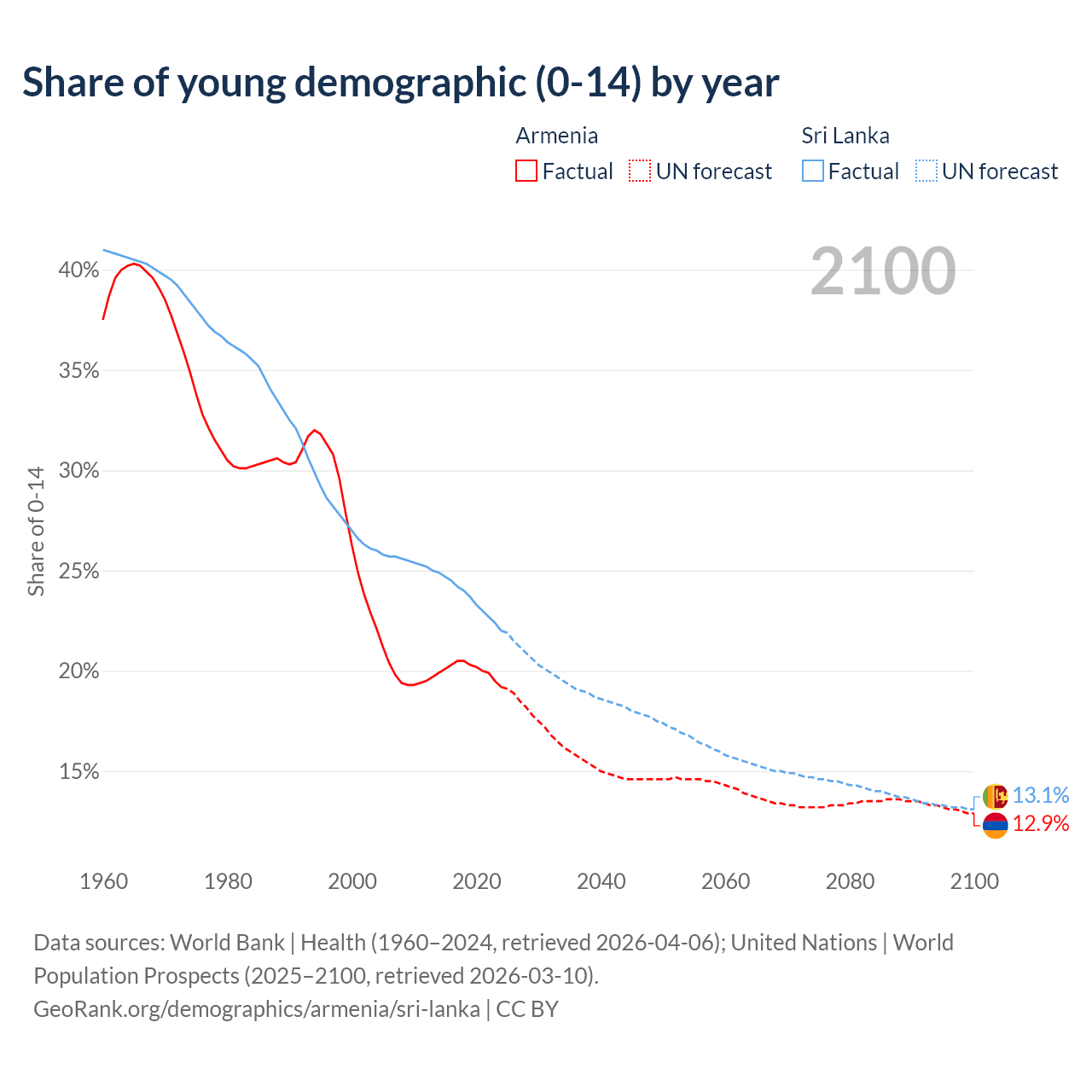- The share of young demographic (0-15 years old) in Armenia is 19.2% vs 22% in Sri Lanka.