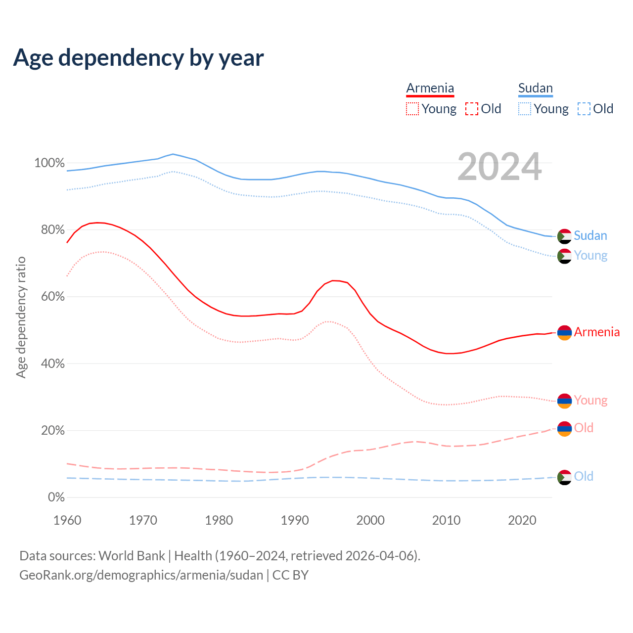 - Armenia is ranked 64/196 by median age (oldest to youngest) vs 172/196 for Sudan.