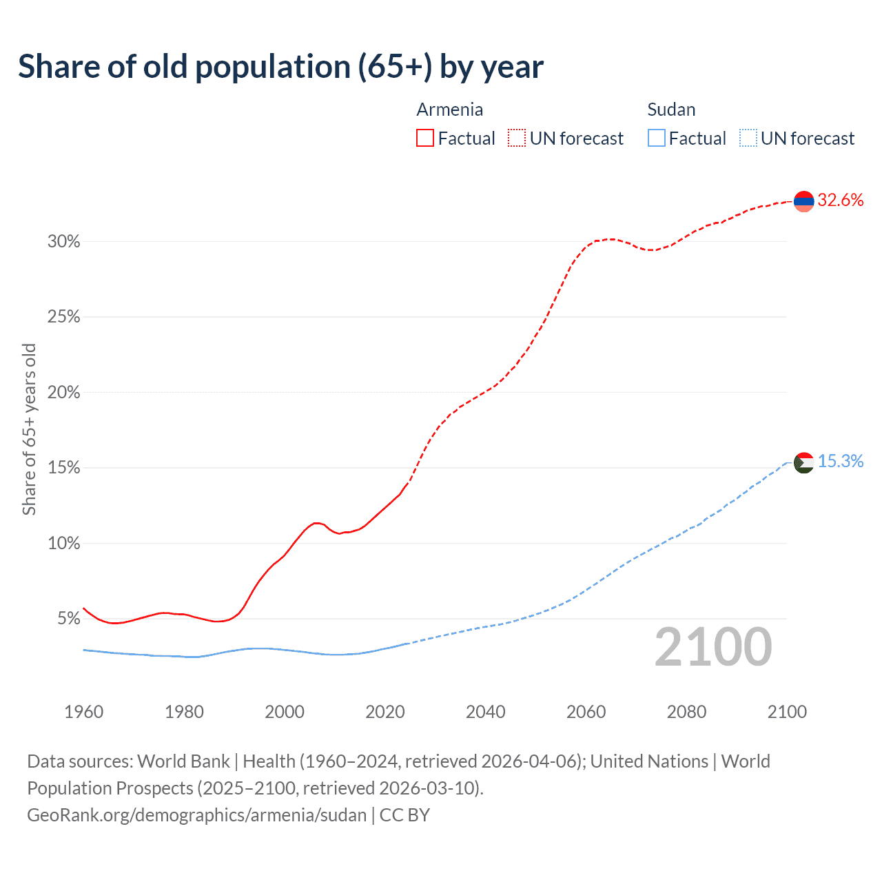 The share of older people aged 65 and over is 13.7% in Armenia and 3.3% in Sudan. Life expectancy in Armenia compared to Sudan .