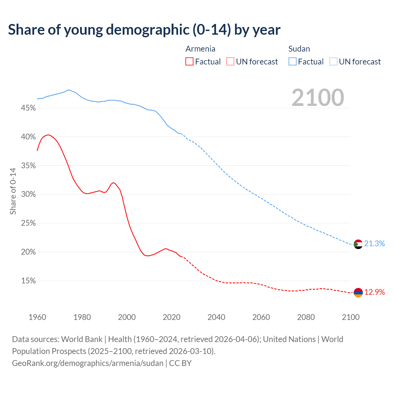 - The share of young demographic (0-15 years old) in Armenia is 19.2% vs 40.5% in Sudan.
