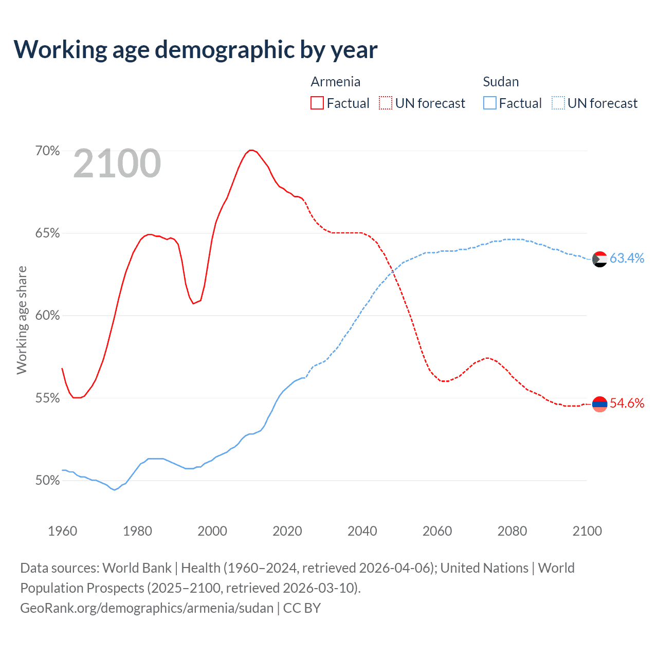- Armenia has 2M working age adults (aged 15-64) vs 30M in Sudan.