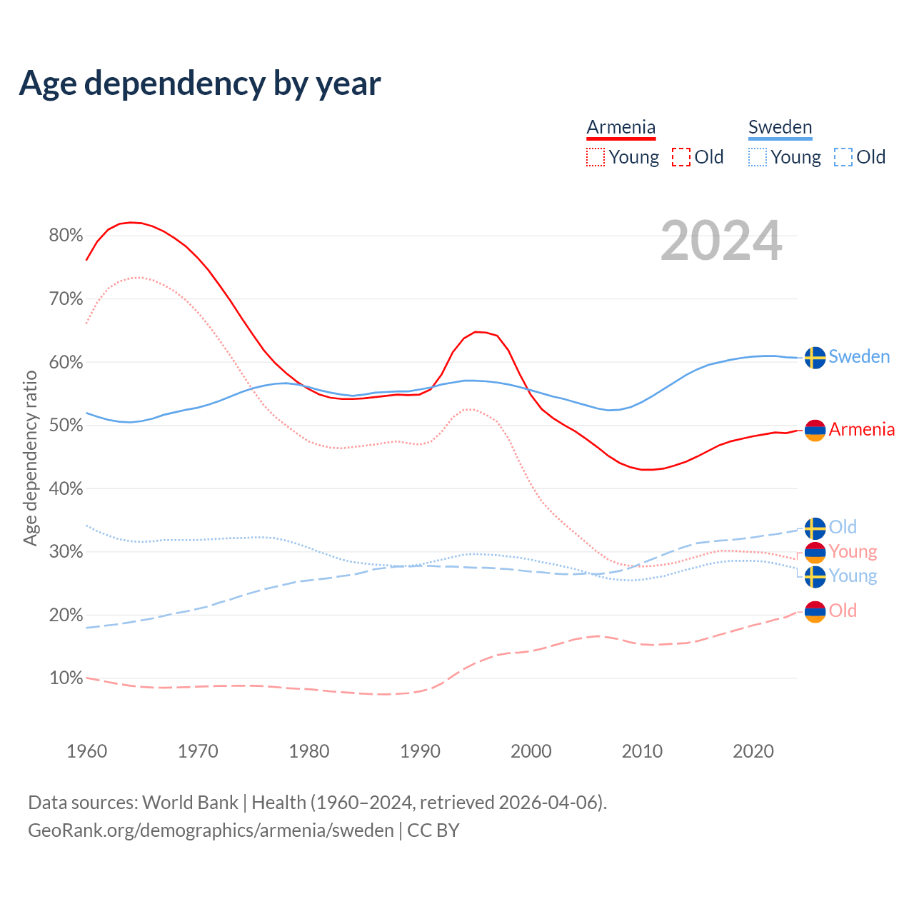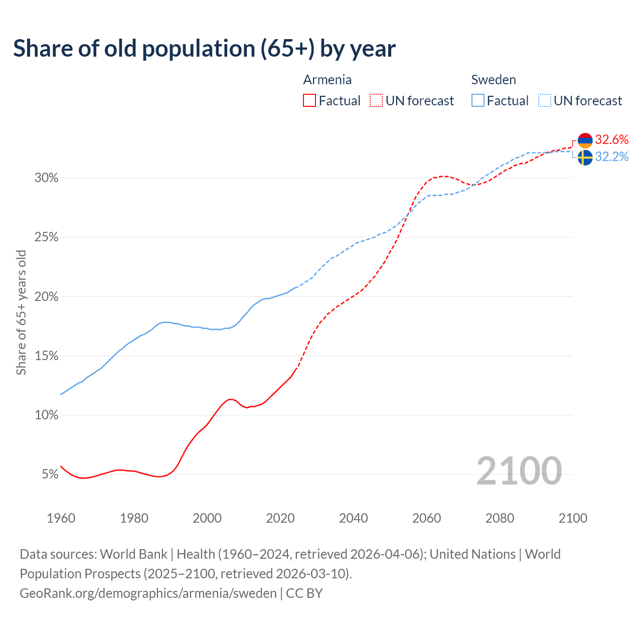 The share of older people aged 65 and over is 13.7% in Armenia and 20.7% in Sweden. Life expectancy in Armenia compared to Sweden .