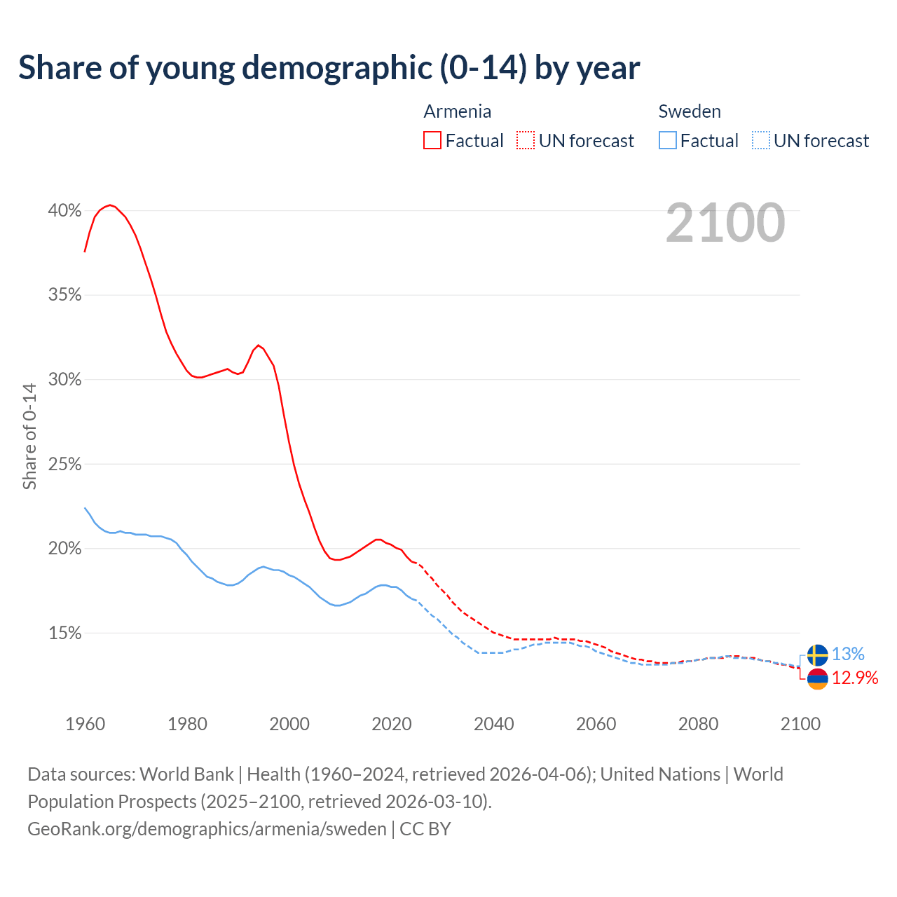 - The share of young demographic (0-15 years old) in Armenia is 19.2% vs 17% in Sweden.