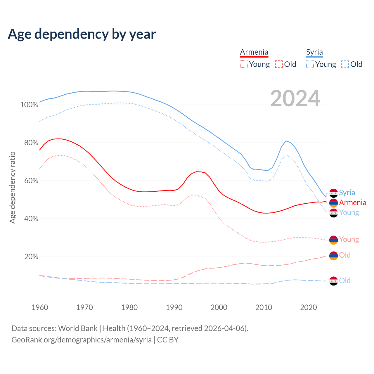 - The share of old-age demographic (65+) in Armenia is 13.7% vs 4.74% in Syria.