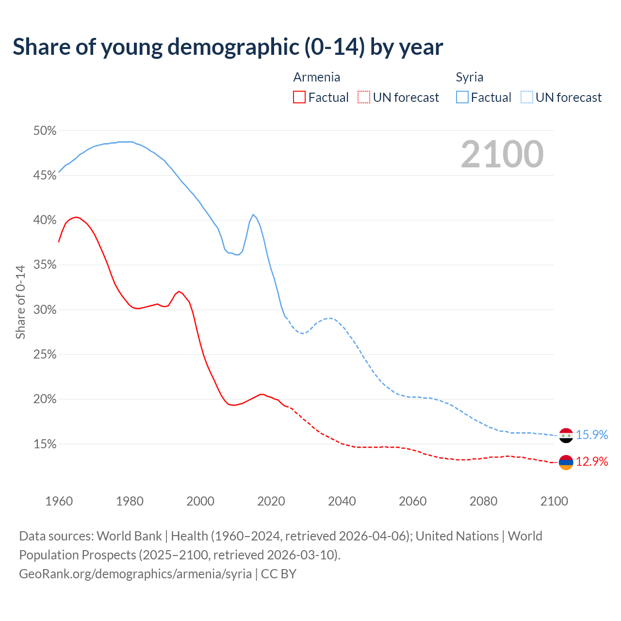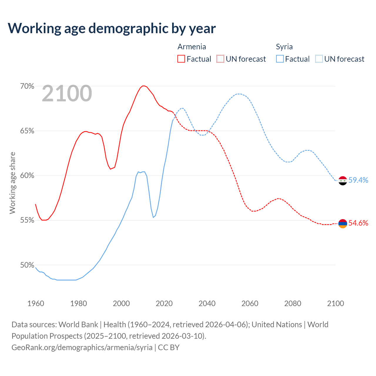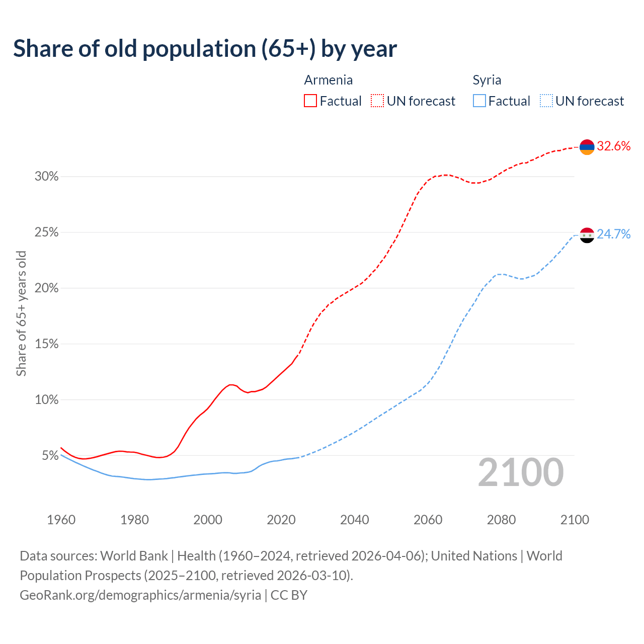 Median age Armenia vs Syria, 1960-2100