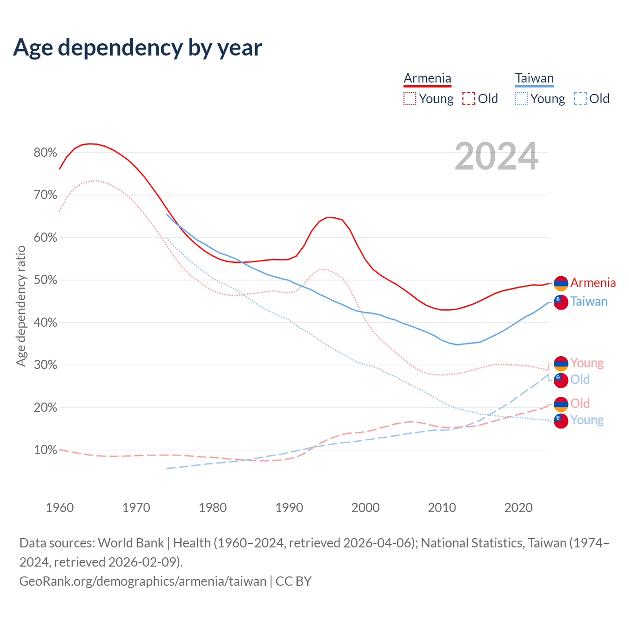 Data sources: World Bank | Health (1960–2024, retrieved 2026-04-06); U.S. Census Bureau (1960–2024, retrieved 2026-02-08); National Statistics, Taiwan (1974–2024, retrieved 2026-02-09).
