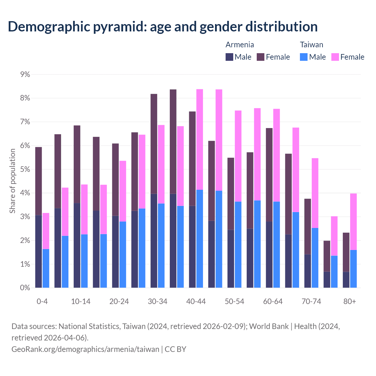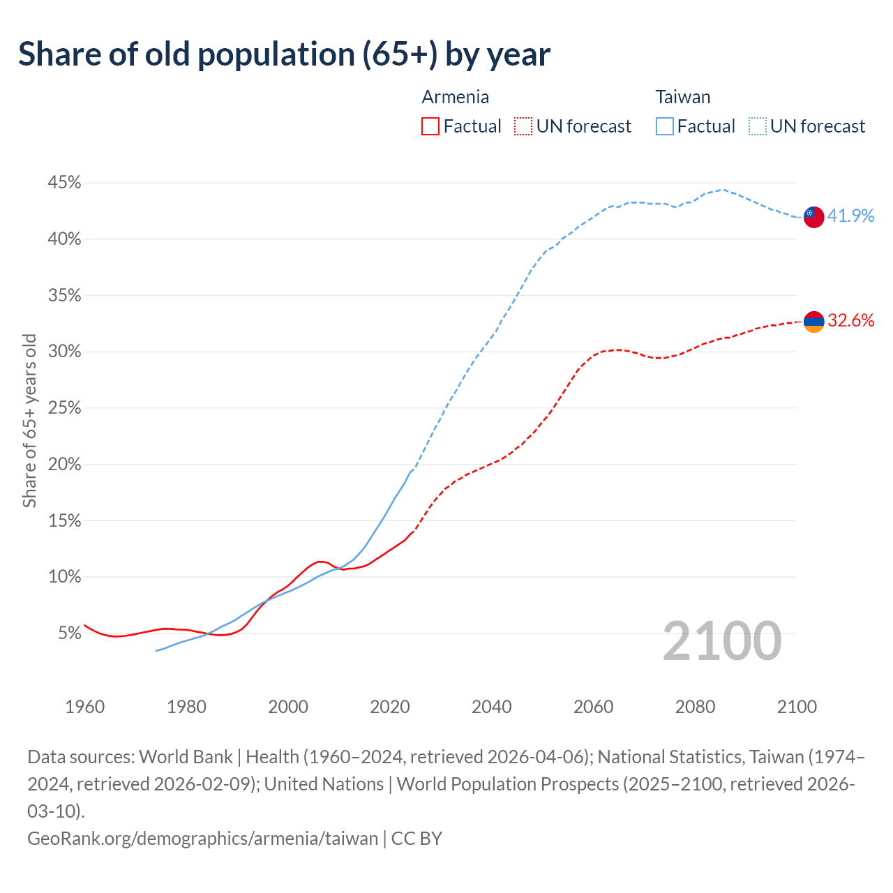 The share of older people aged 65 and over is 13.7% in Armenia and 19.2% in Taiwan. Life expectancy in Armenia compared to Taiwan .