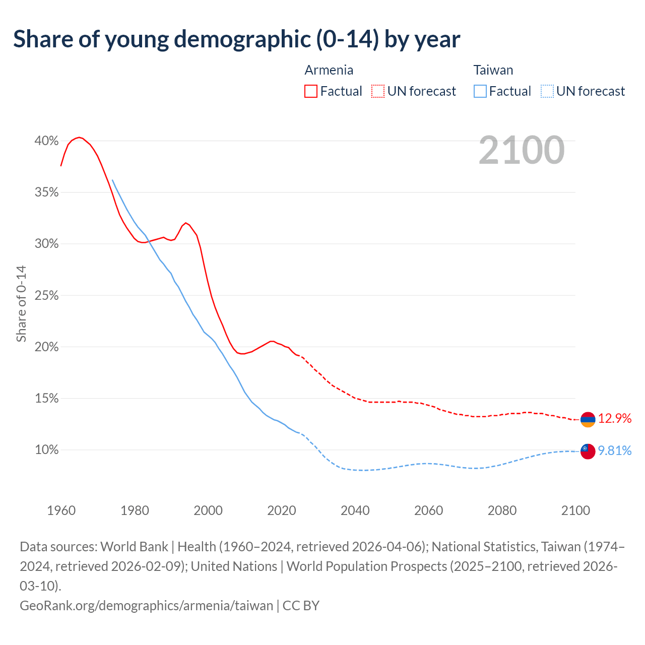 - The share of young demographic (0-15 years old) in Armenia is 19.2% vs 11.7% in Taiwan.