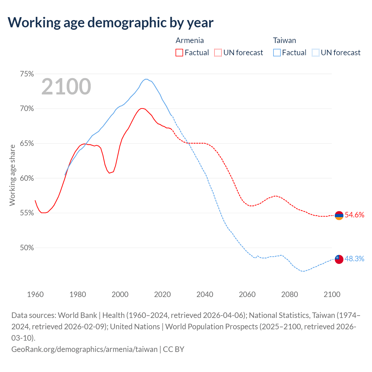 Median age Armenia vs Taiwan, 1960-2100