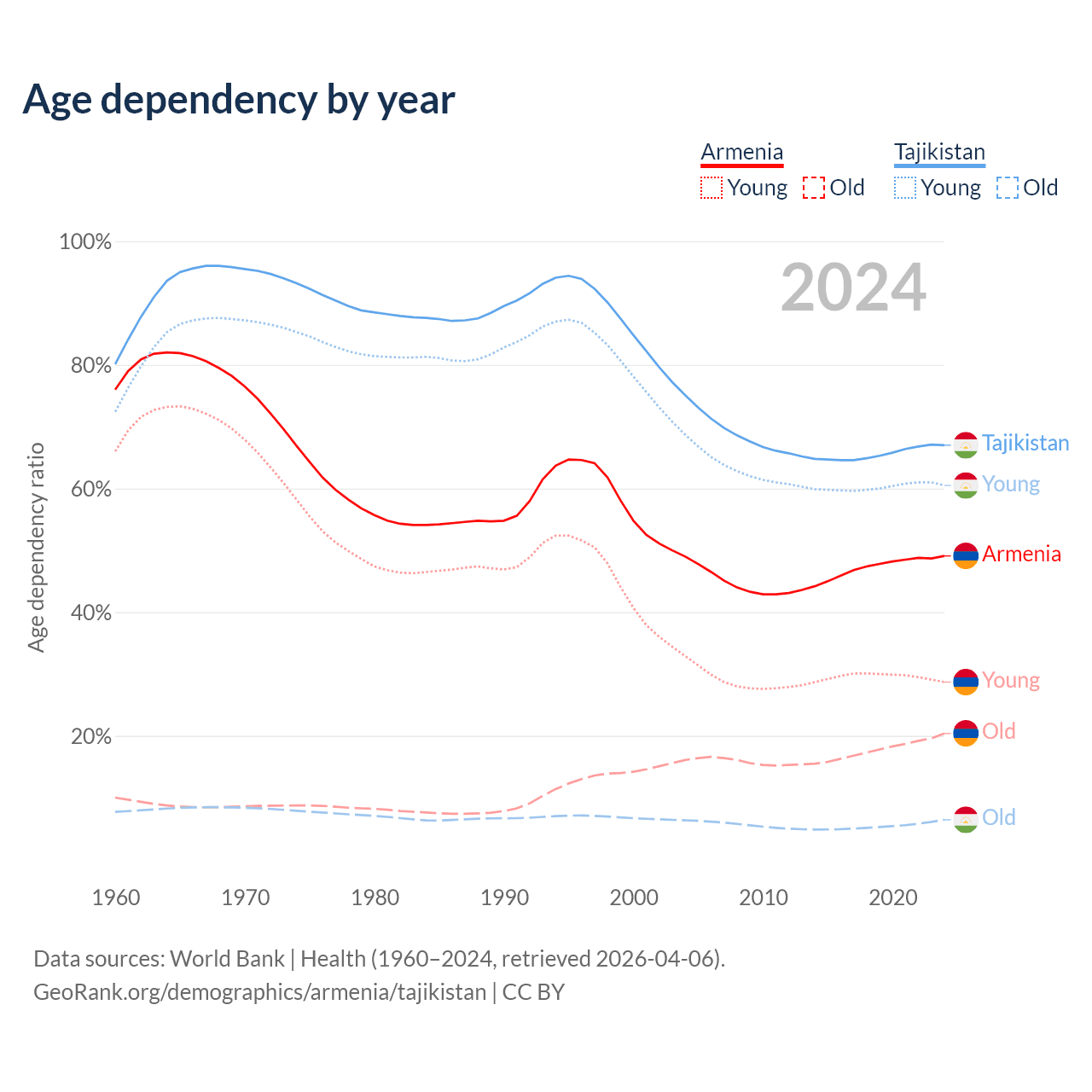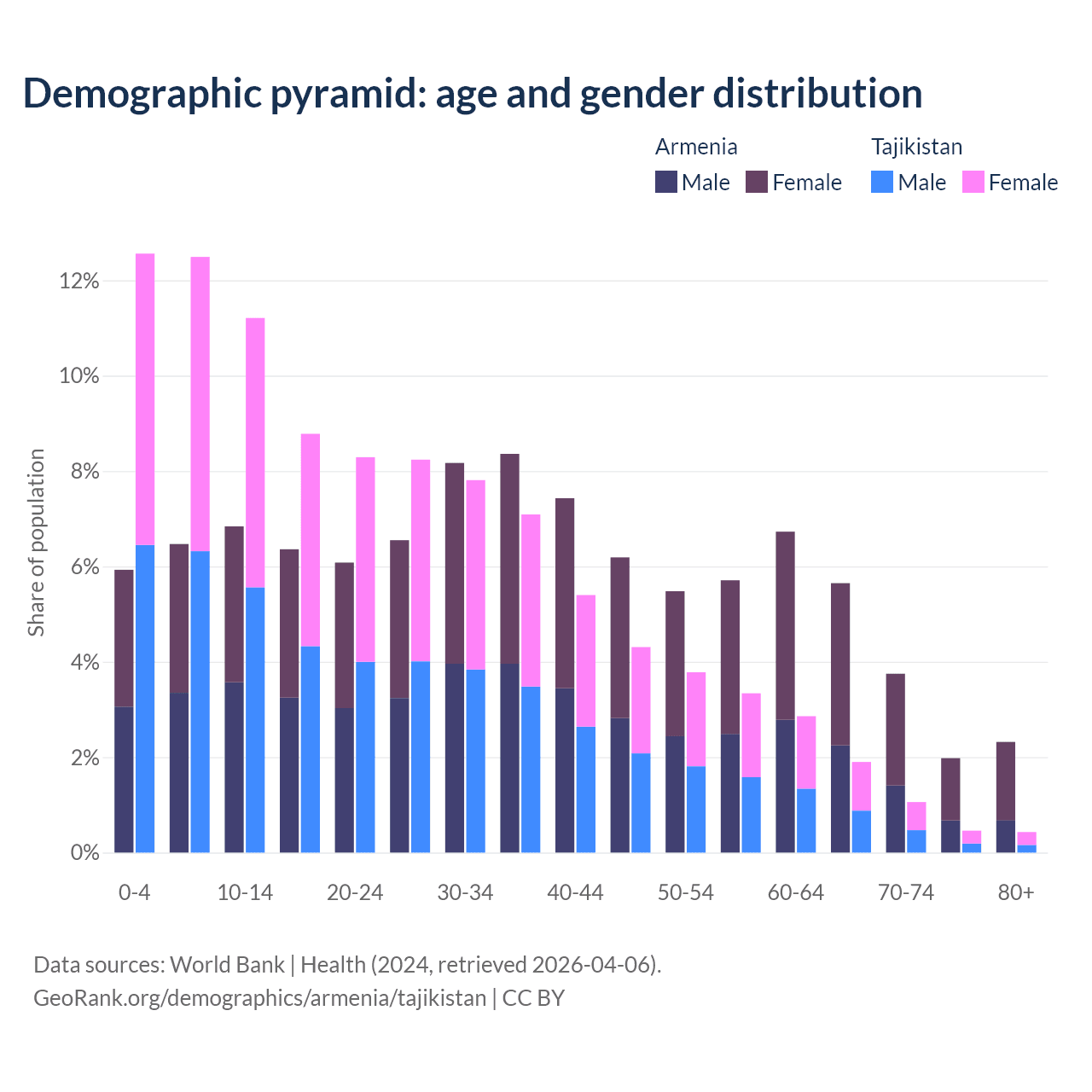 - Armenia is ranked 64/196 by median age (oldest to youngest) vs 142/196 for Tajikistan.