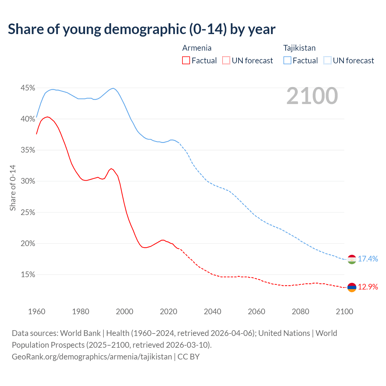 - The share of young demographic (0-15 years old) in Armenia is 19.2% vs 36.3% in Tajikistan.