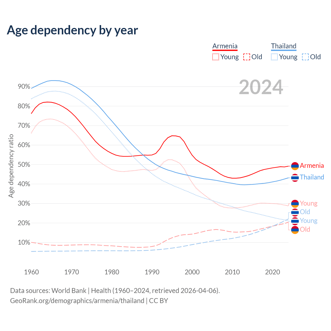 - Armenia is ranked 64/196 by median age (oldest to youngest) vs 40/196 for Thailand.
