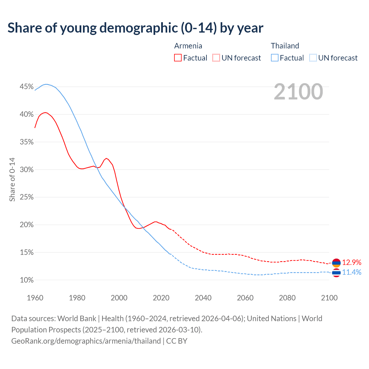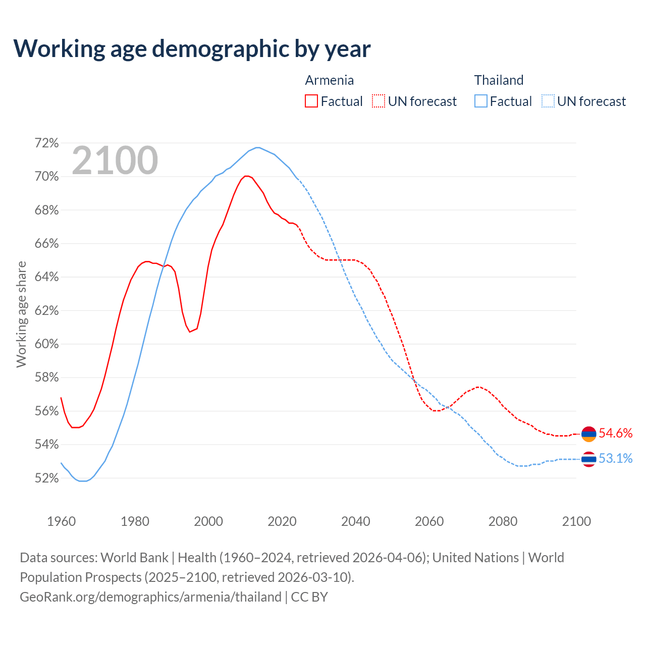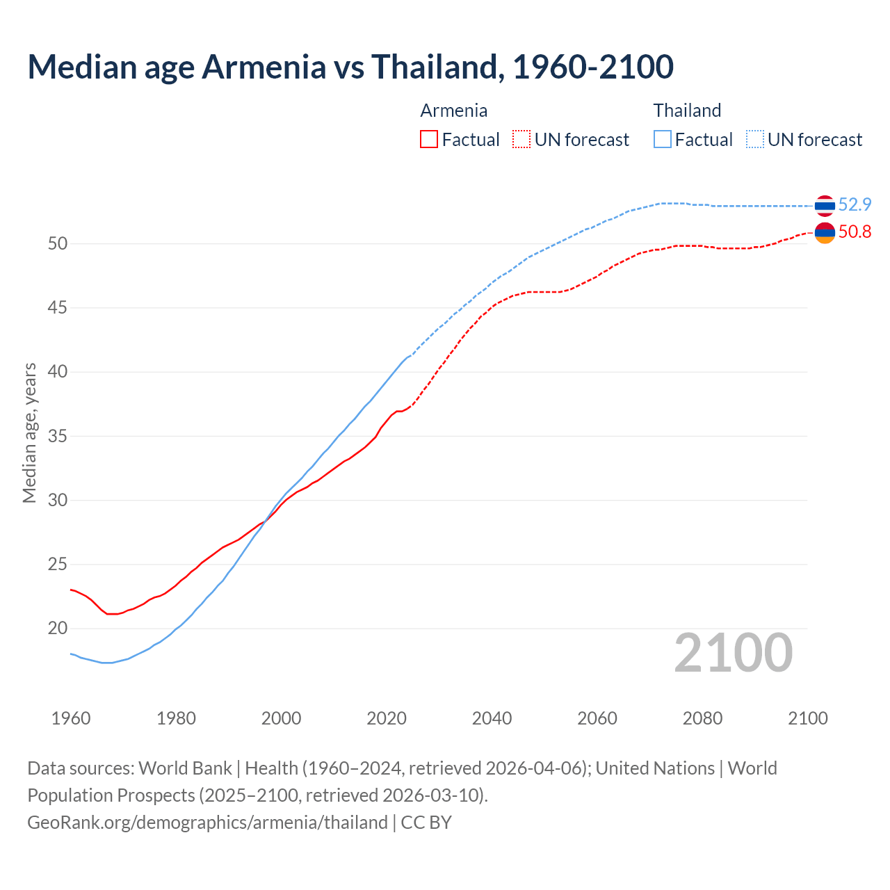 Median age Armenia vs Thailand, 1960-2100