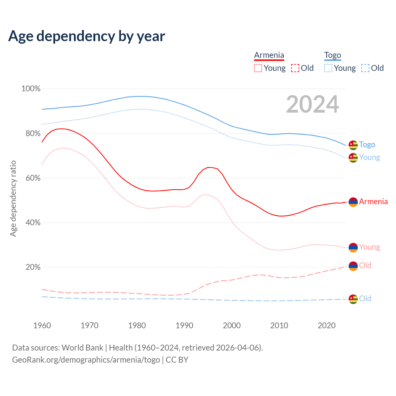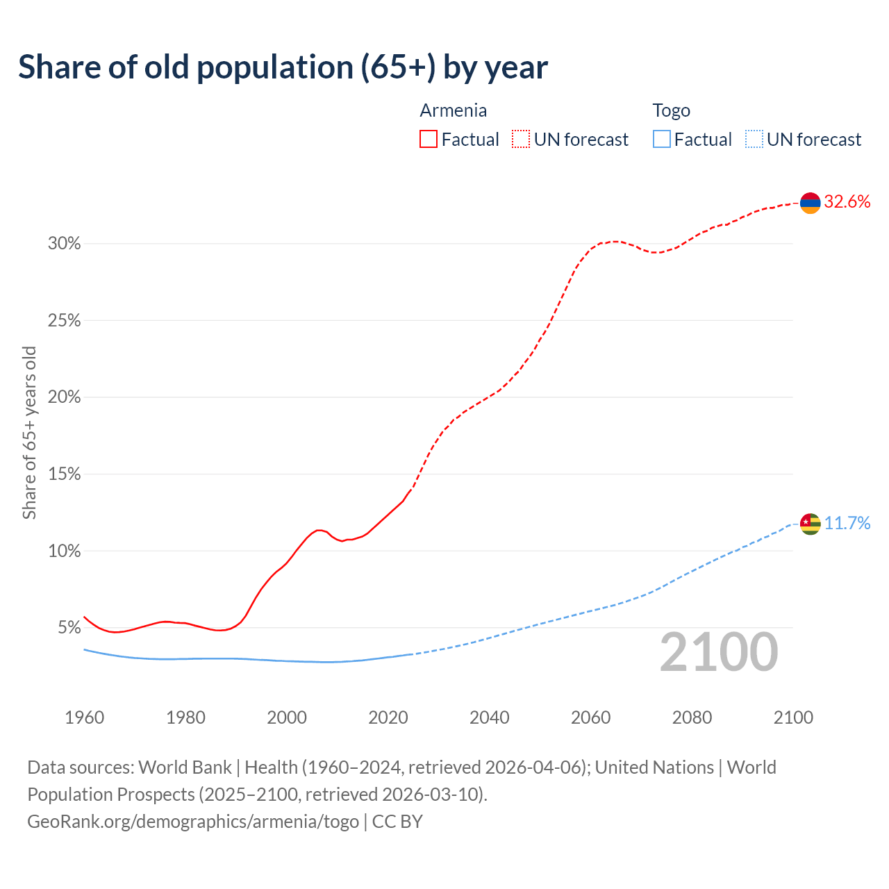 The share of older people aged 65 and over is 13.7% in Armenia and 3.21% in Togo. Life expectancy in Armenia compared to Togo .