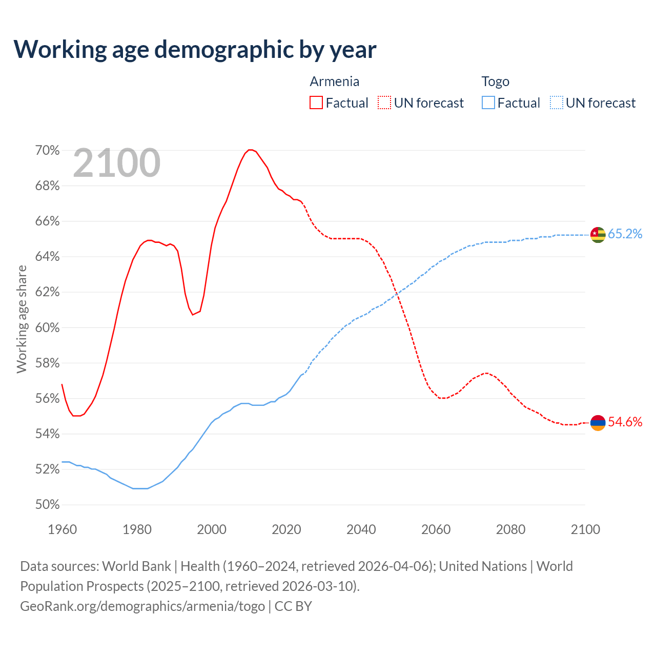 - Armenia has 2M working age adults (aged 15-64) vs 5.72M in Togo.