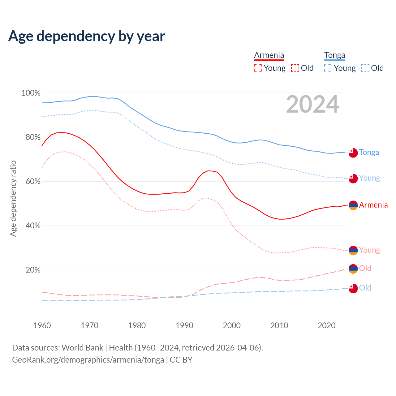 - Armenia is ranked 64/196 by median age (oldest to youngest) vs 149/196 for Tonga.