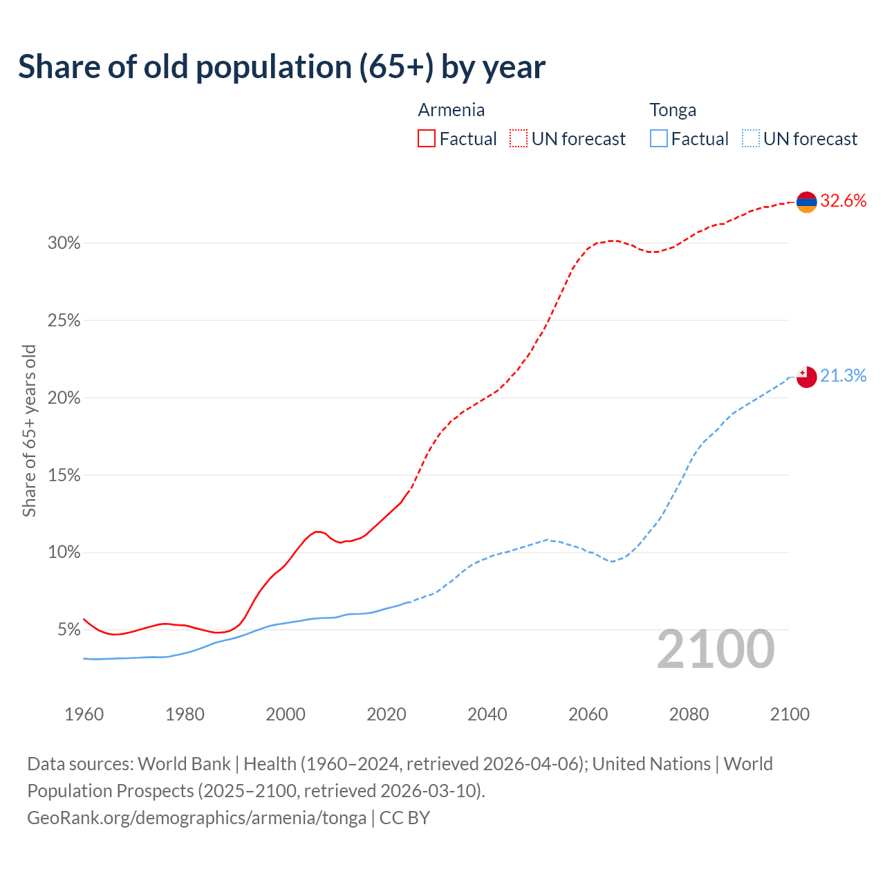 - The share of old-age demographic (65+) in Armenia is 13.7% vs 6.72% in Tonga.