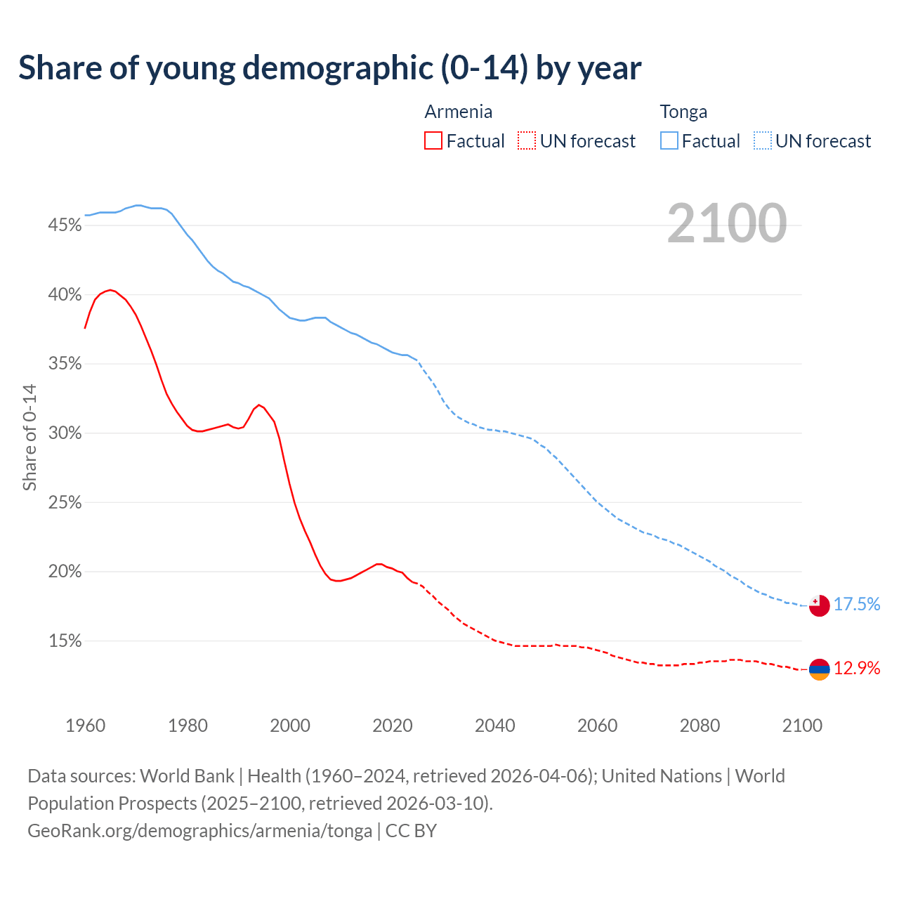 - The share of young demographic (0-15 years old) in Armenia is 19.2% vs 35.4% in Tonga.