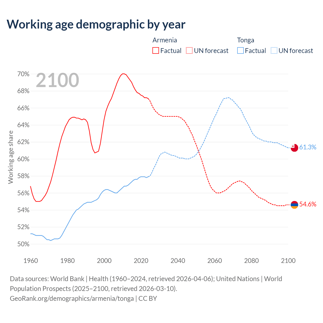 - Armenia has 2M working age adults (aged 15-64) vs 59.8K in Tonga.