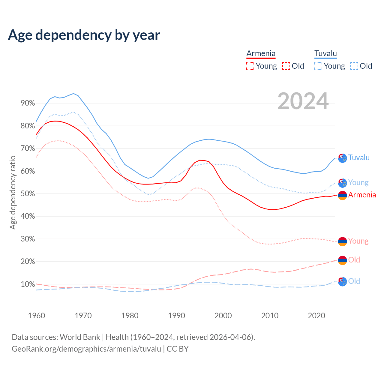 - The share of old-age demographic (65+) in Armenia is 13.7% vs 6.67% in Tuvalu.