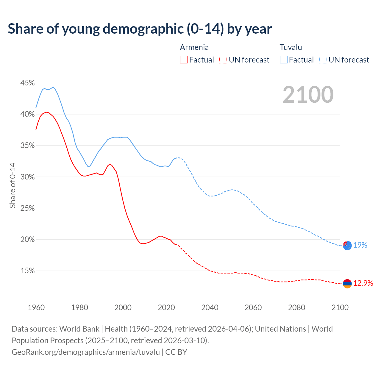 - The share of young demographic (0-15 years old) in Armenia is 19.2% vs 32.9% in Tuvalu.