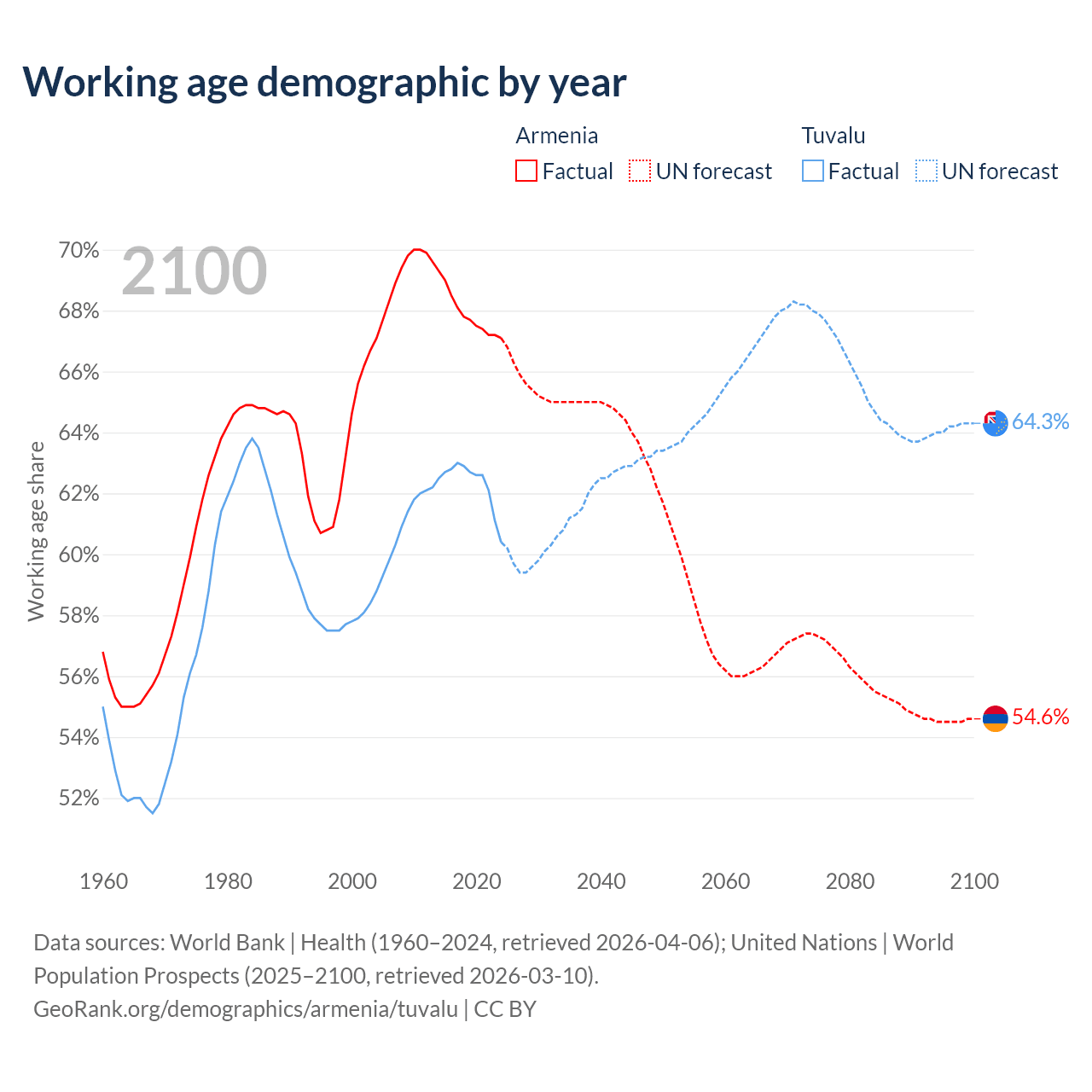 - Armenia has 2M working age adults (aged 15-64) vs 5.64K in Tuvalu.
