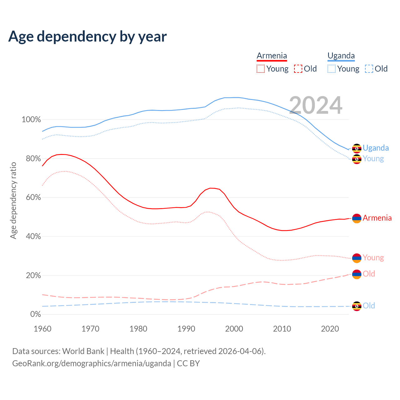 - The share of old-age demographic (65+) in Armenia is 13.7% vs 2.19% in Uganda.
