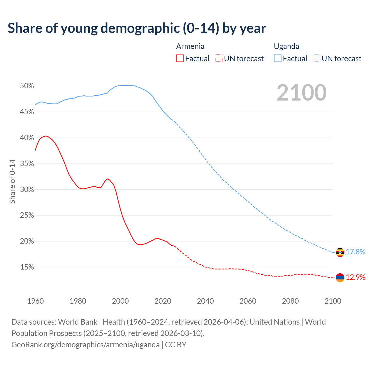 - The share of young demographic (0-15 years old) in Armenia is 19.2% vs 43.5% in Uganda.