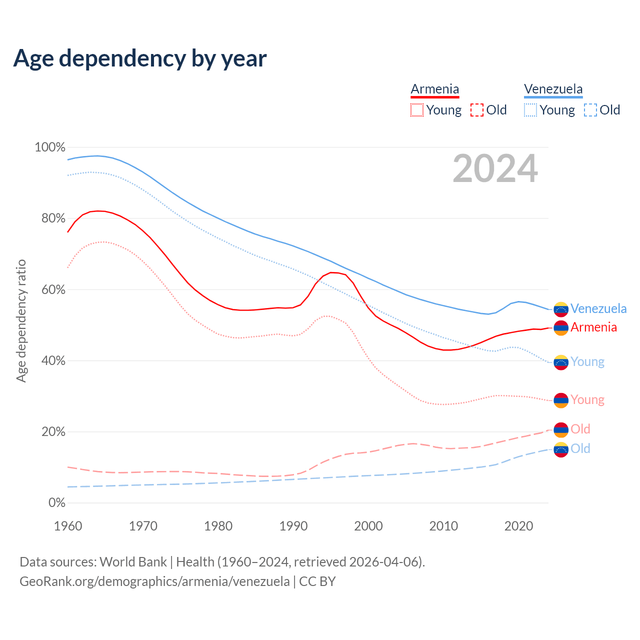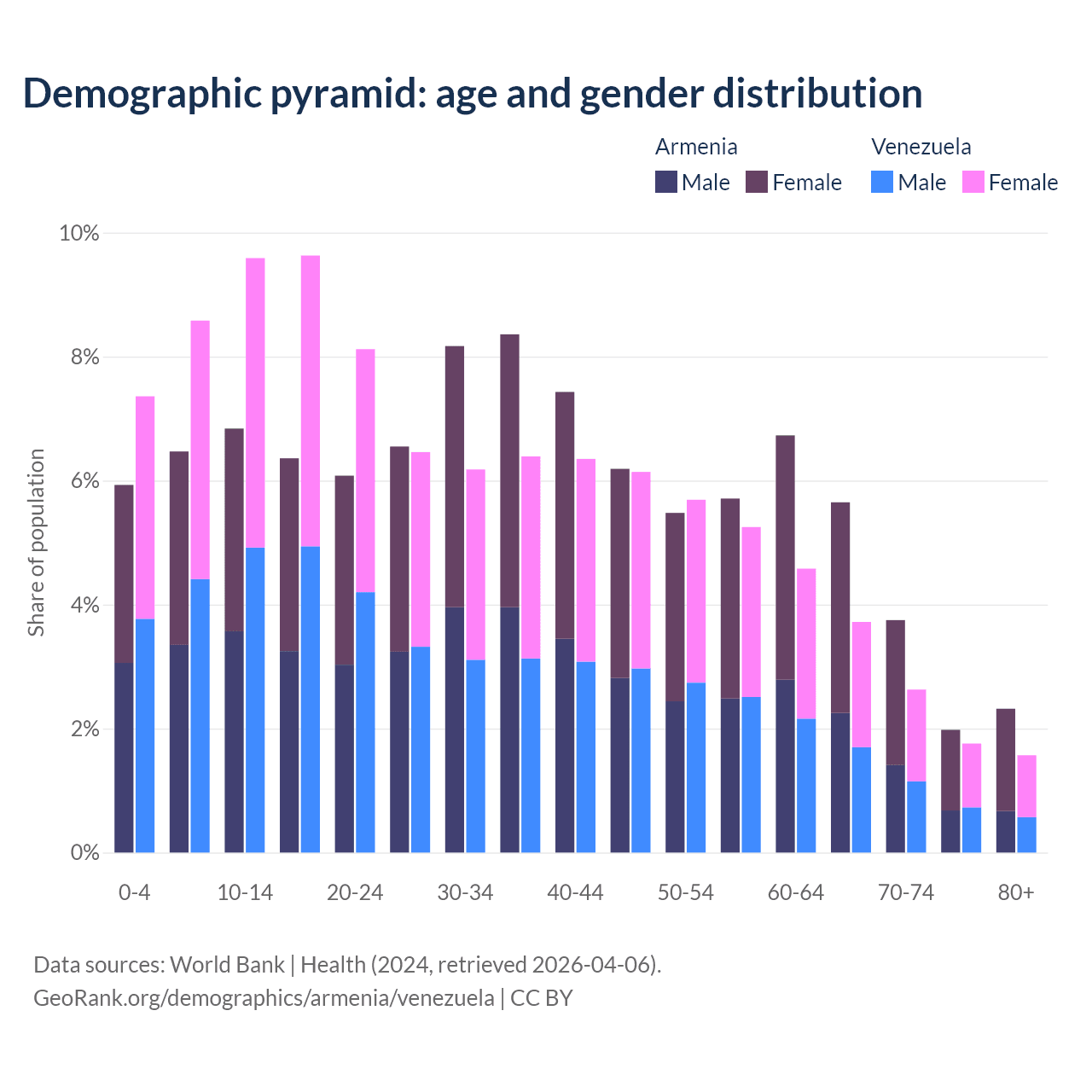 - Armenia is ranked 64/196 by median age (oldest to youngest) vs 104/196 for Venezuela.