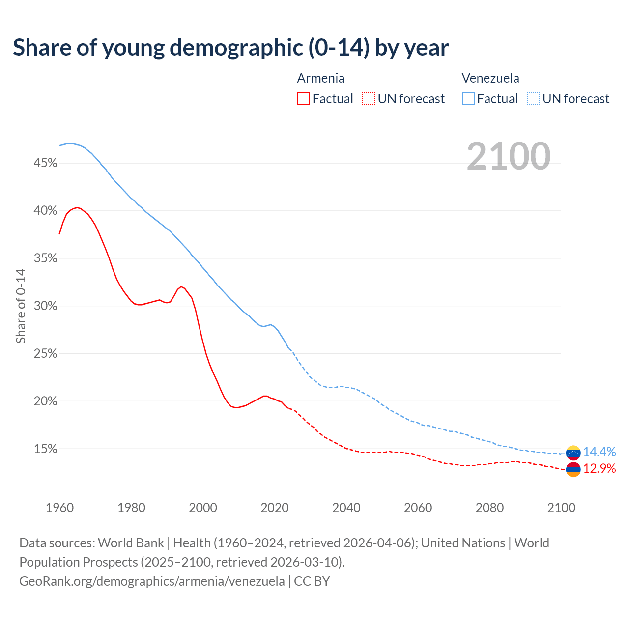 - The share of young demographic (0-15 years old) in Armenia is 19.2% vs 25.5% in Venezuela.