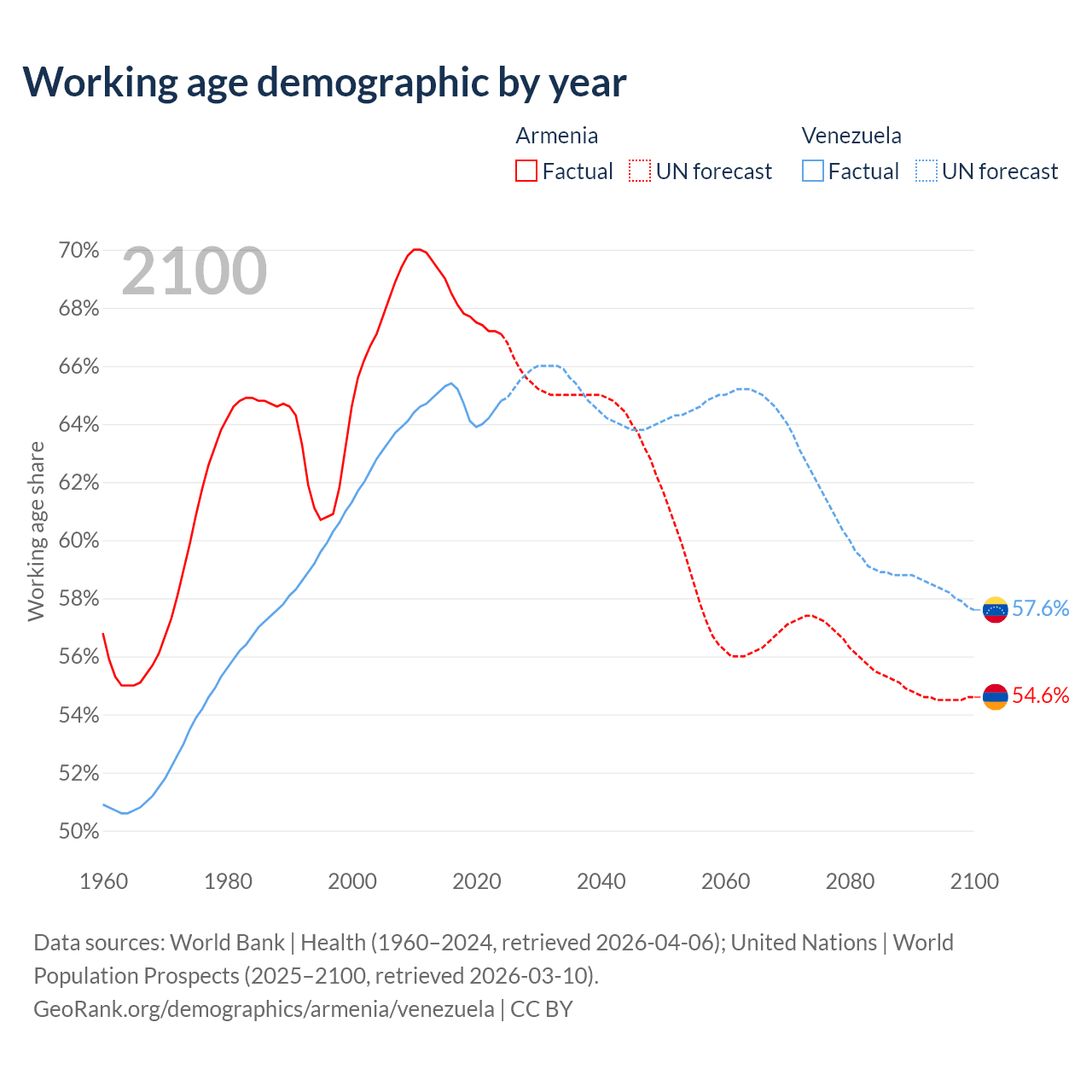 - Armenia has 2M working age adults (aged 15-64) vs 18.6M in Venezuela.